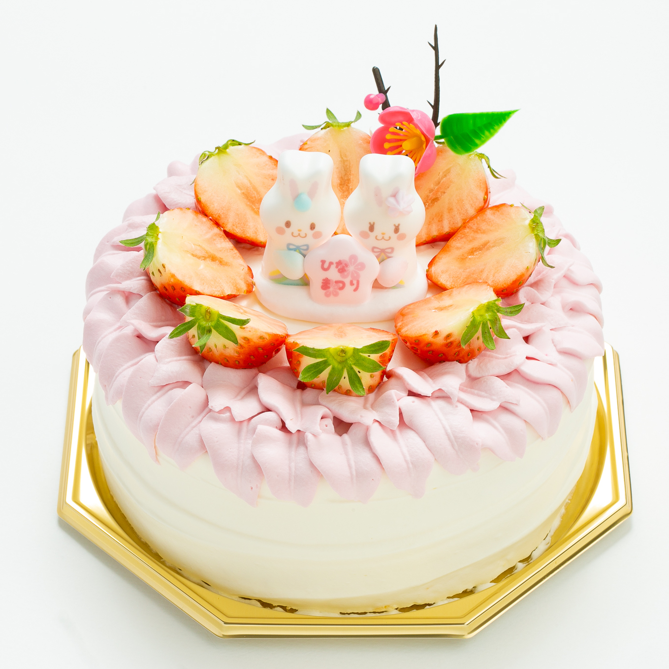 採れたていちごをたっぷり乗せて、中にもいちごと生クリームをサンド。おひなさま、おだいりさまが飾られた可愛いデコレーションケーキです。